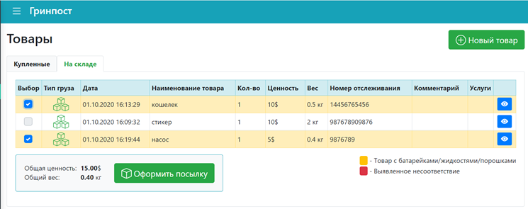 Во вкладке «На складе» выделите товары, которые необходимо объединить в одну посылку и нажмите «Оформить» в нижней части экрана. Остается указать получателя и мы соберем посылку для вас для отгрузки.